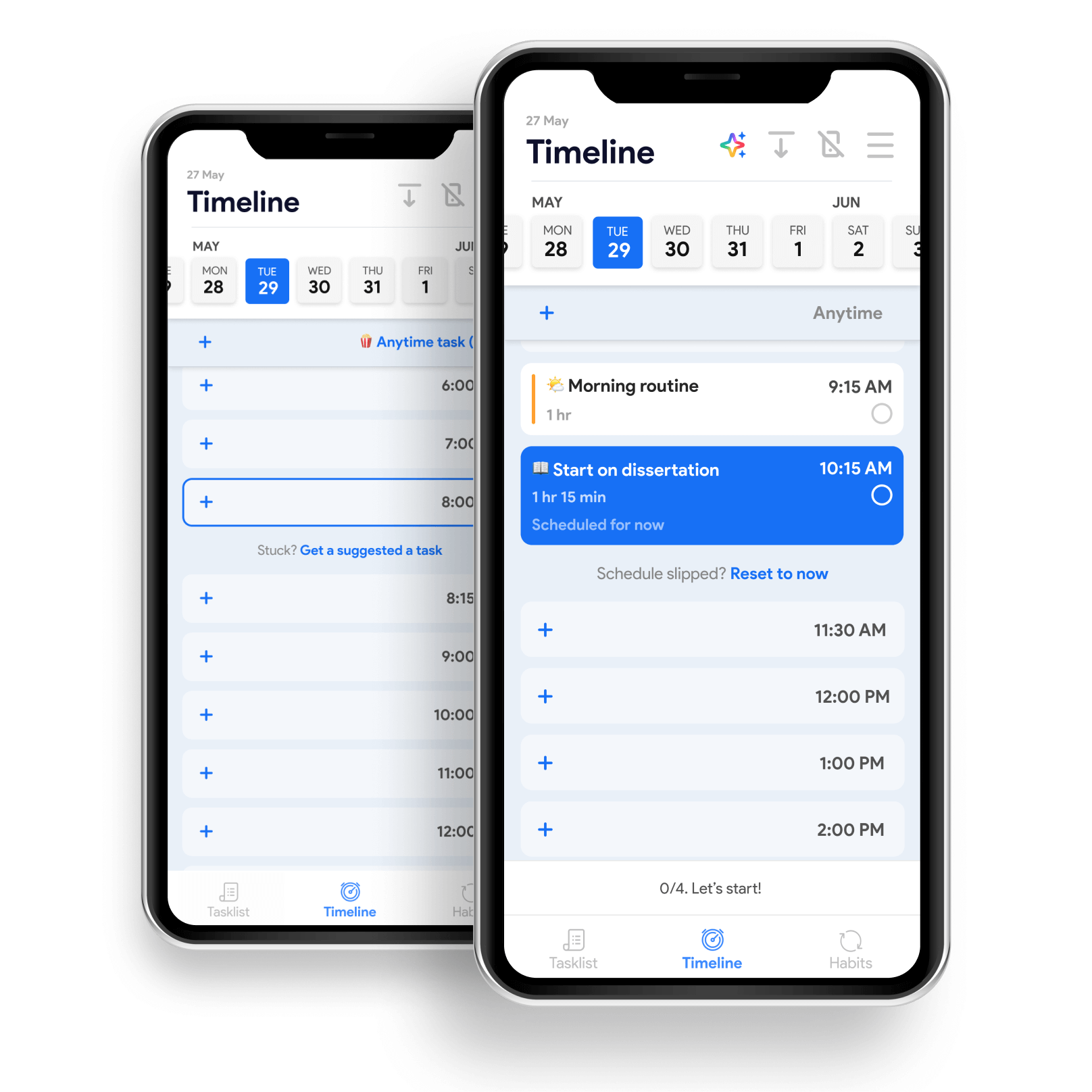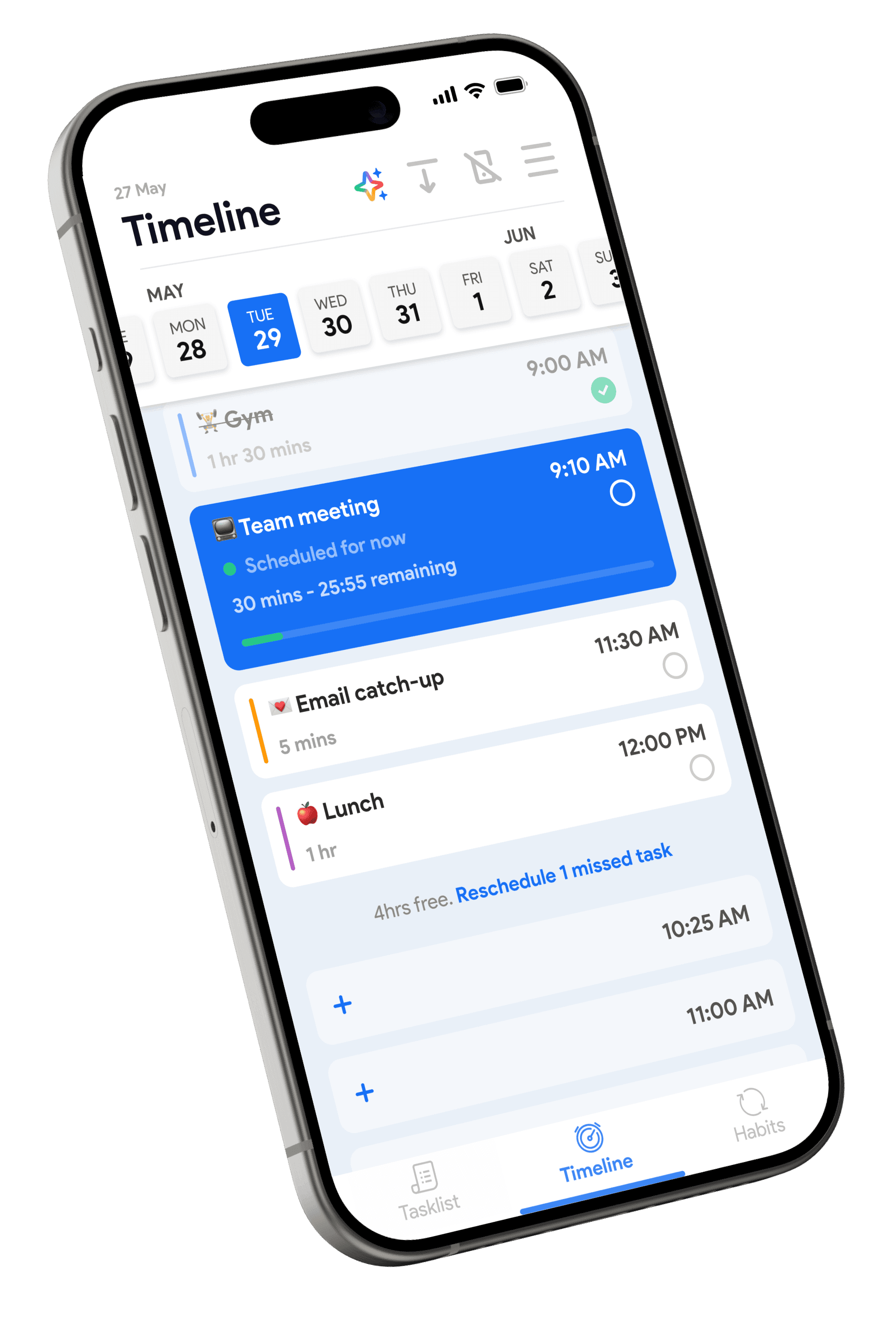 Free gets you the full planner: time-blocking, focus timer, auto-reschedule, habits. Pro adds the app blocker, Instaplan, AI task breakdown, Google Calendar sync, and priority support.